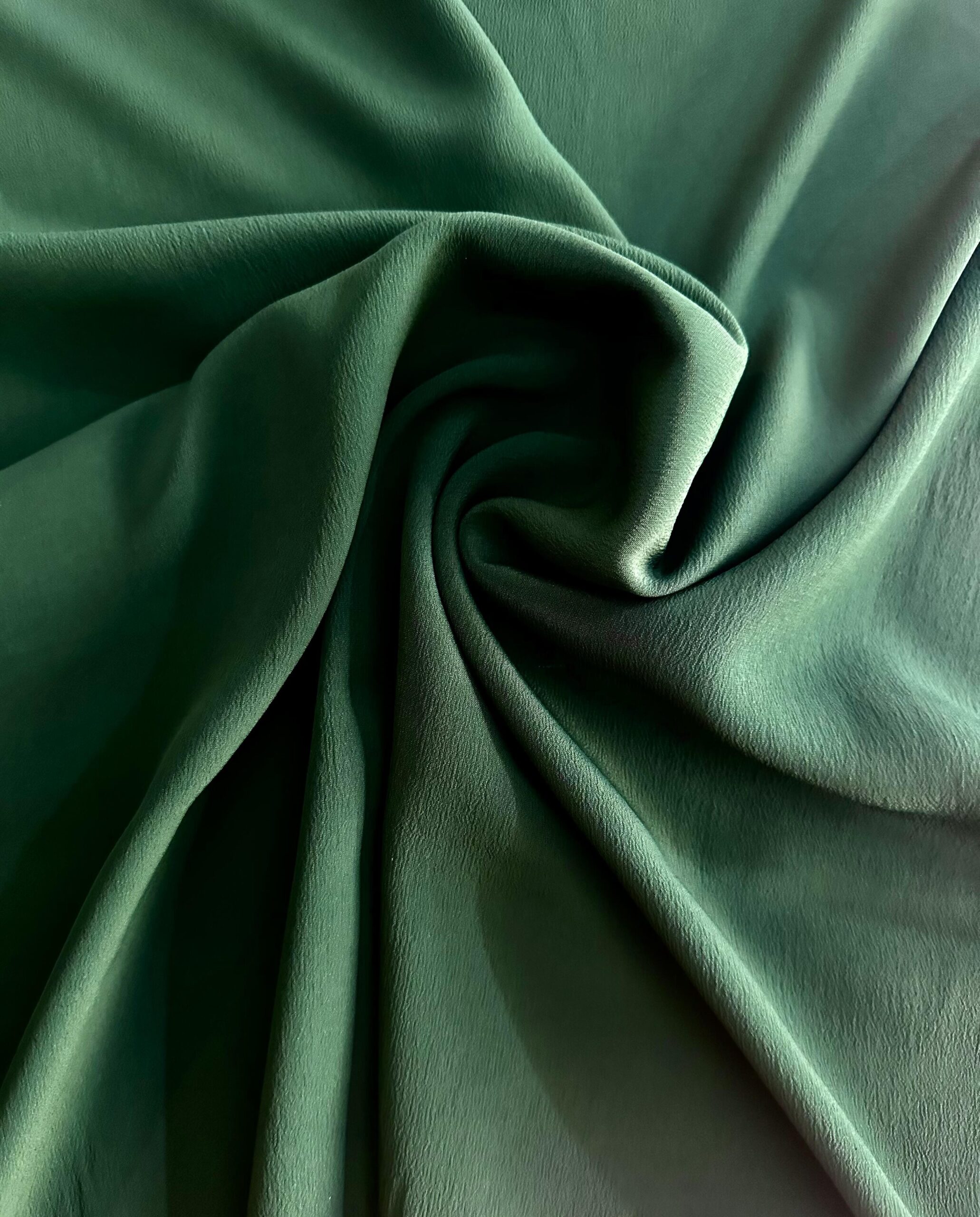 Luxusní italská látka z acetátu a hedvábí v tmavě zelené barvě. Jemný lesk a splývavost dělají z této látky ideální volbu na šaty, halenky i elegantní večerní módu. Acetát s hedvábím je prodyšný, lehký a velmi příjemný na nošení. Složení 60 % acetát a 40 % hedvábí. Šířka 140 cm.