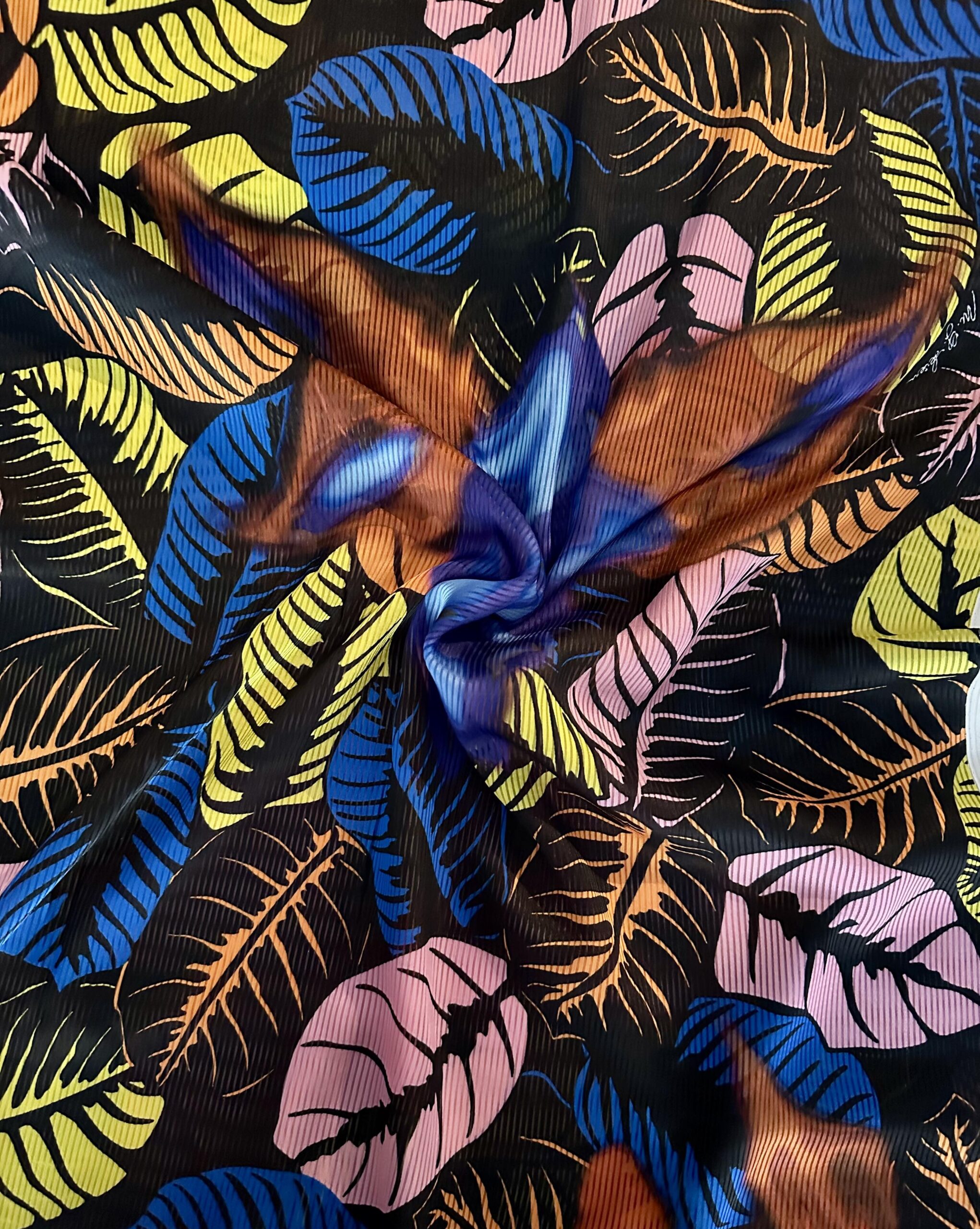 Exkluzivní italská látka Maria Spinelli z 100% viskózy s moderním listovým vzorem je ideální volbou pro ty, kdo hledají luxusní design a vysokou kvalitu. Barevná kombinace modré, růžové, žluté a oranžové na černém podkladupůsobí sofistikovaně a elegantně.