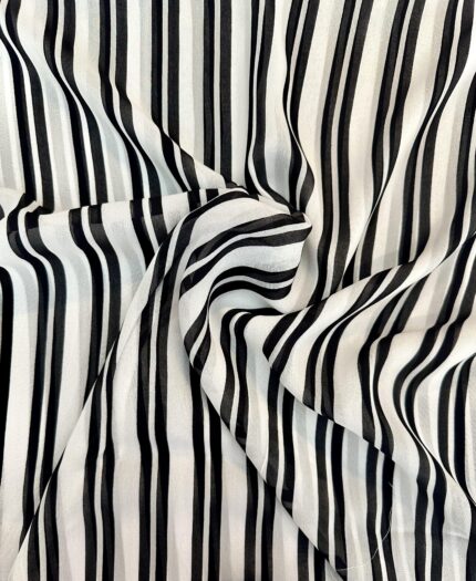 Lehká a splývavá směsová tkanina s elegantním černo-bílým pruhovaným vzorem. Jemná, vzdušná a příjemná na dotek, ideální na šaty, halenky, tuniky i letní sukně.-