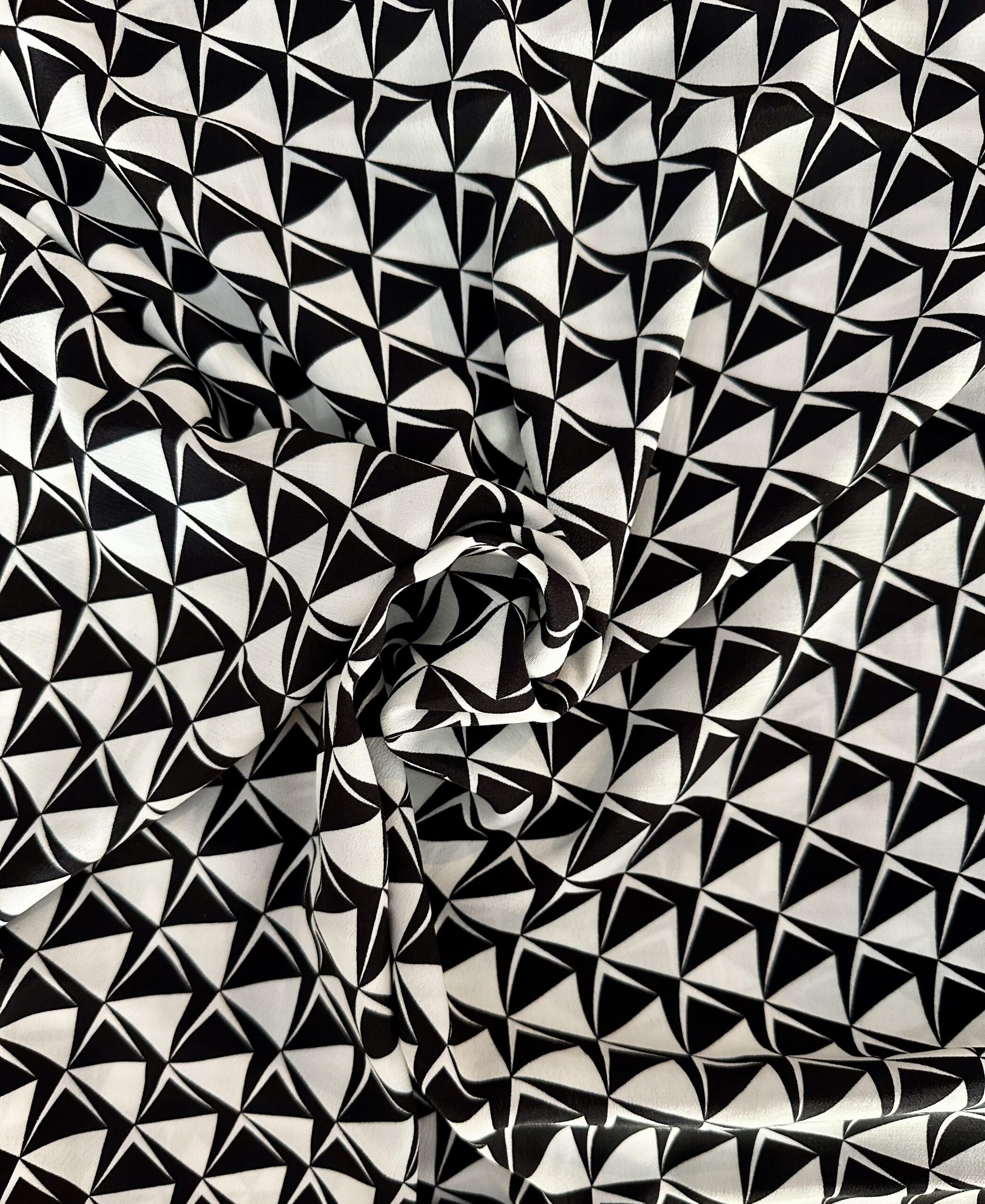 Italská látka z 100% viskózy s výrazným černo-bílým geometrickým vzorem. Skvělá na šaty, halenky i moderní košile.