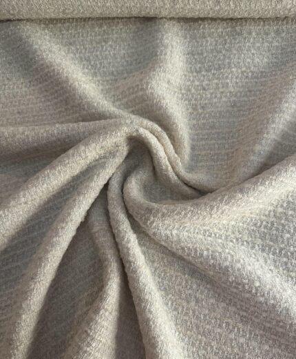 Exkluzivní italská kabátová látka ve stylu Chanel v elegantní krémové barvě s jemným lurexovým leskem. Luxusní materiál s příměsí vlny a viskózy, ideální na kabáty, pláště, saka a stylové komplety.