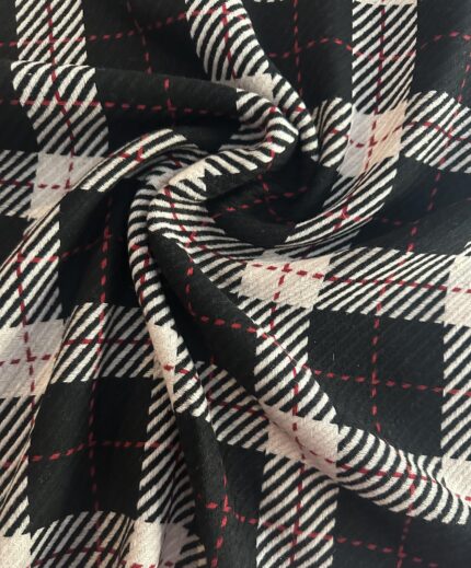 Stylová kabátová látka v černo-bílo-červeném káru. Vyrobena ze směsi 70 % vlny a 30 % polyesteru. Vysoká kvalita a šíře 150 cm. Ideální na kabáty, pláště, saka i sukně.