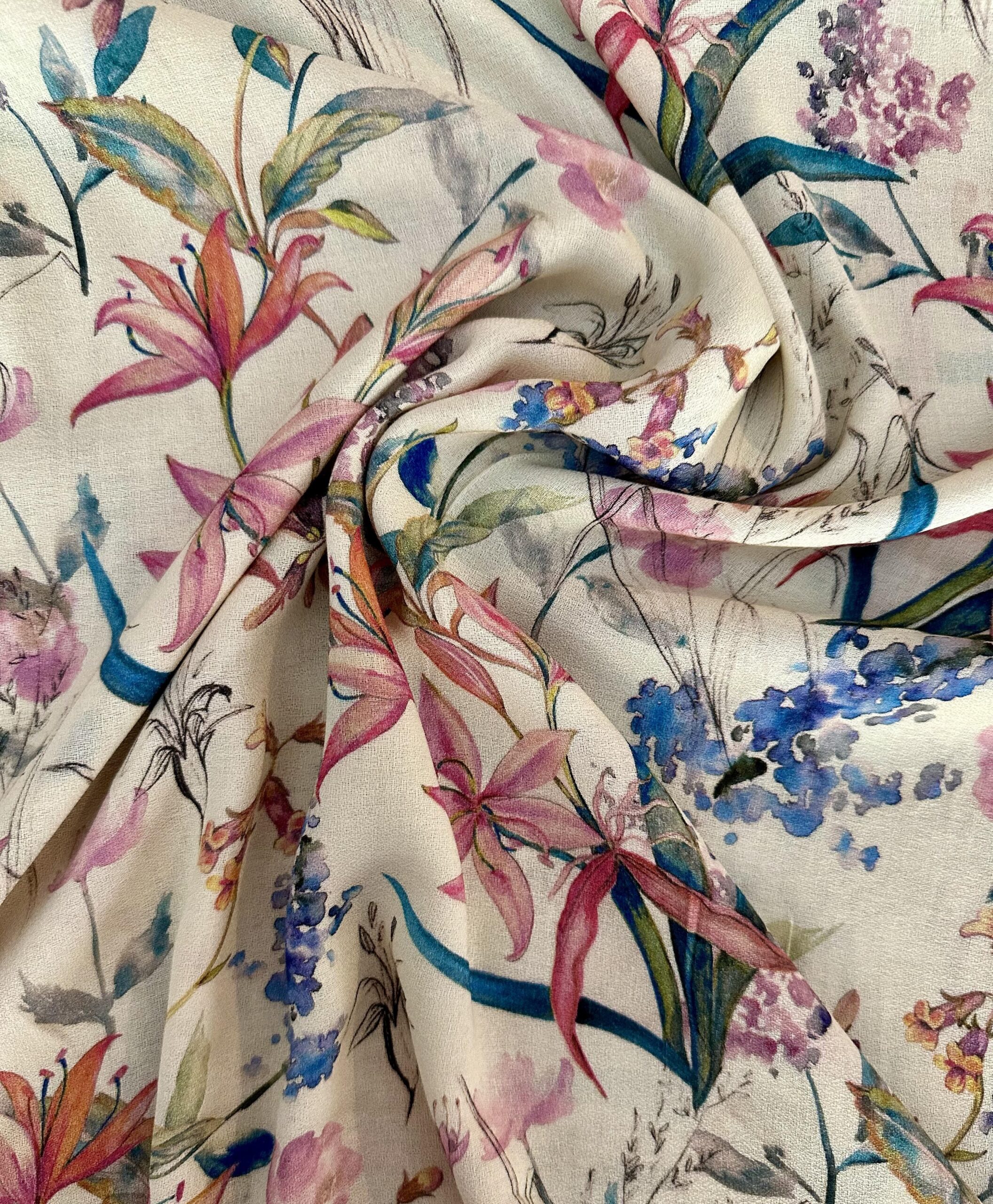 Lehká a vzdušná italská viskóza metráž s květinovým motivem. Pokud chcete koupit látku v Praze, navštivte Tessuti Butik – místo, kde najdete originální italské látky pro oděvy.
