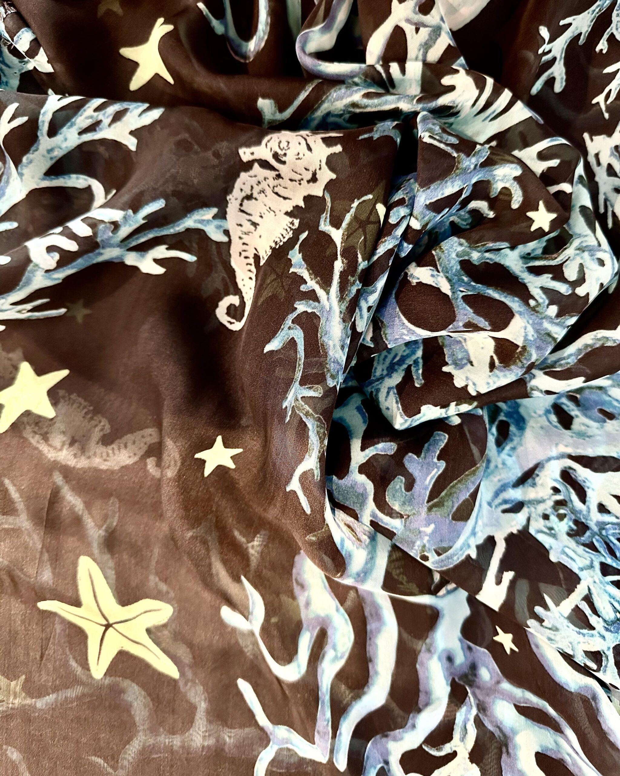 Italská viskózovo-hedvábná látka – mořský vzor s korály, mořskými koníky a hvězdicemi na hnědém podkladu