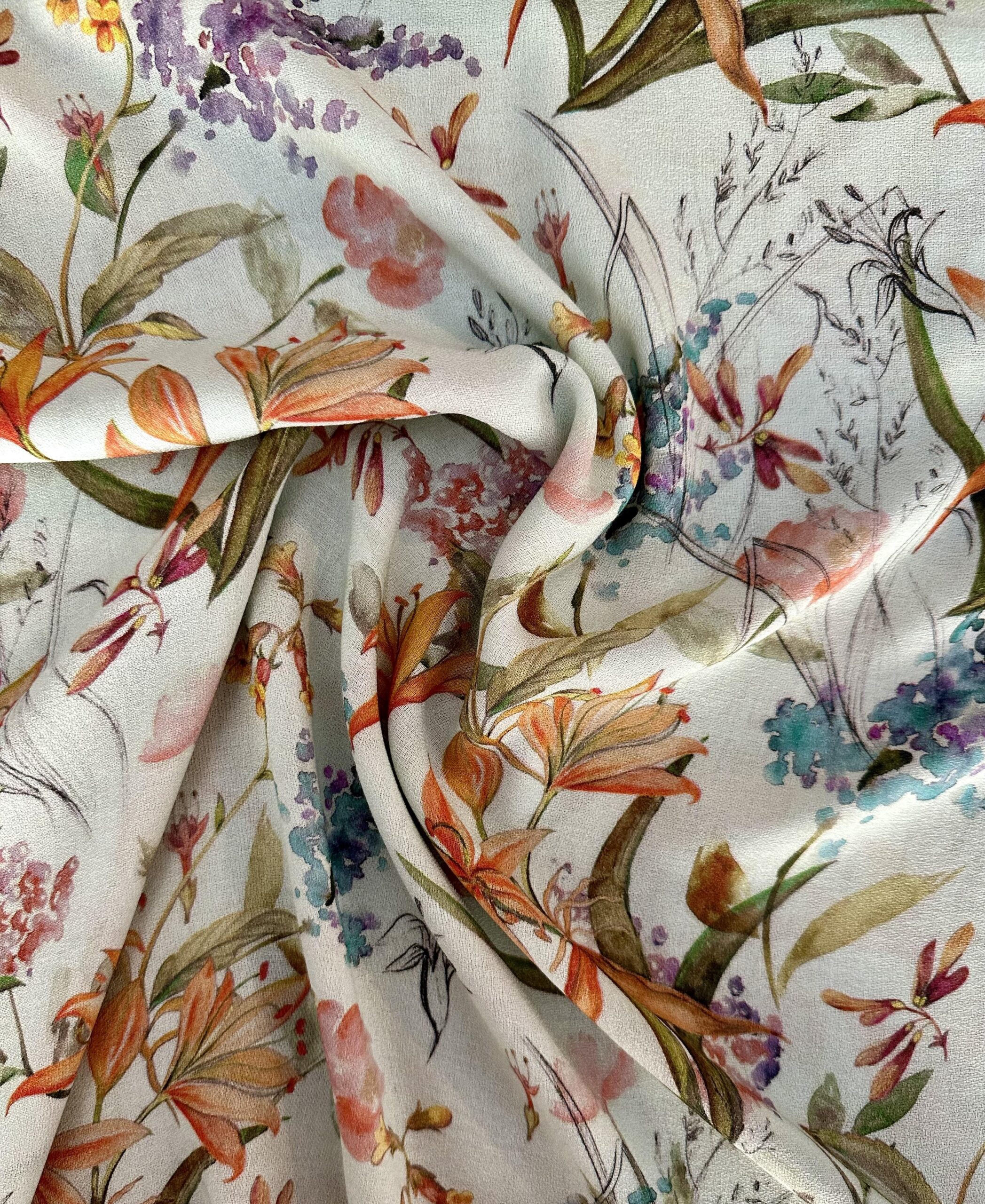 Lehká 100% viskóza metráž z Itálie s elegantním květinovým vzorem. Tyto italské látky jsou ideální jako látky pro oděvy – šaty, halenky nebo letní sukně. Pokud chcete koupit látku v Praze, navštivte obchod Tessuti Butik.