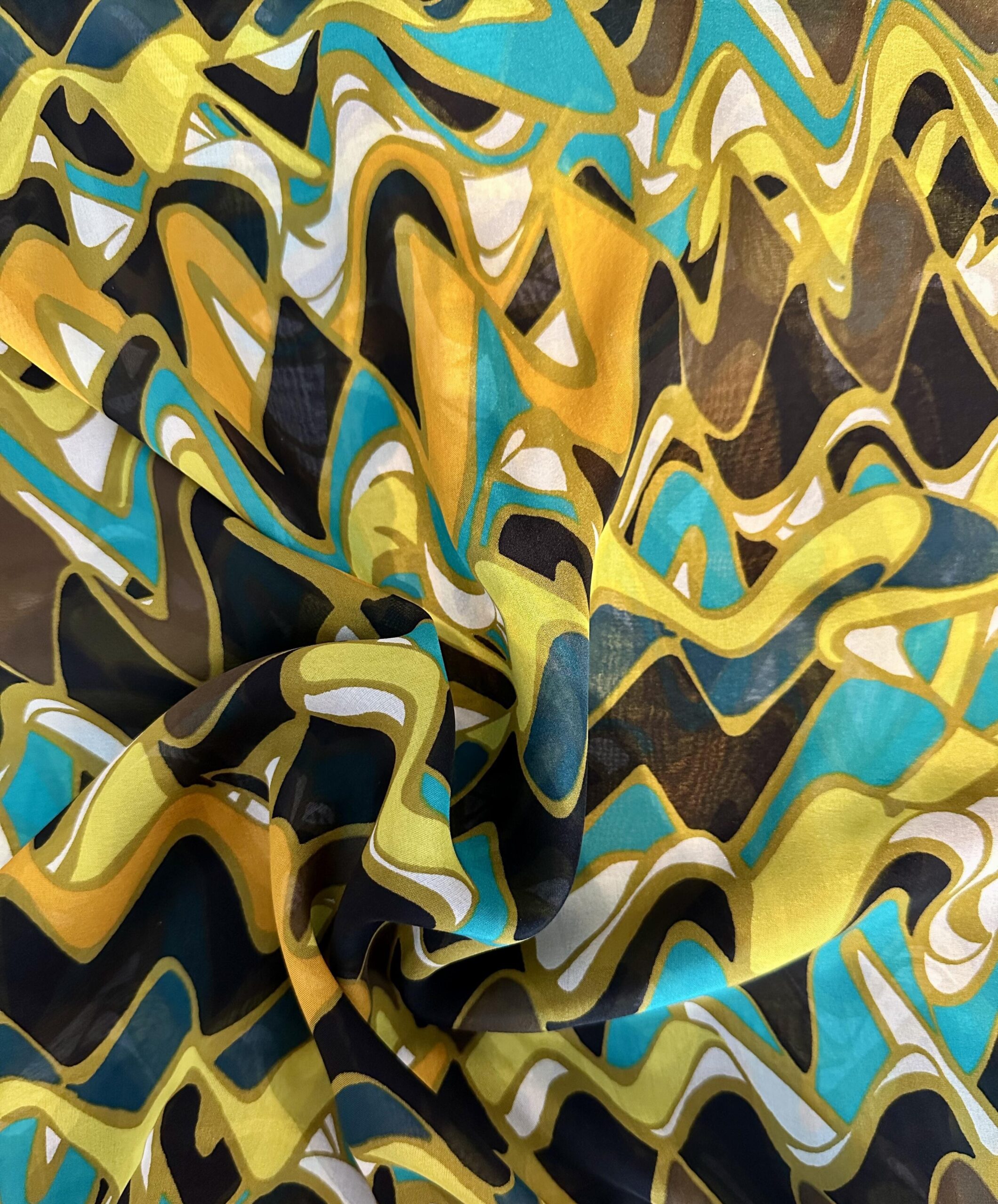 Luxusní hedvábný šifon od značky Maria Garcia Spinelli zaujme svým originálním designem. Průsvitná, lehká a splývavá tkanina s geometrickým abstraktním motivem kombinuje tóny žluté, tyrkysové, černé a bílé, což látce dodává moderní a výrazný charakter.