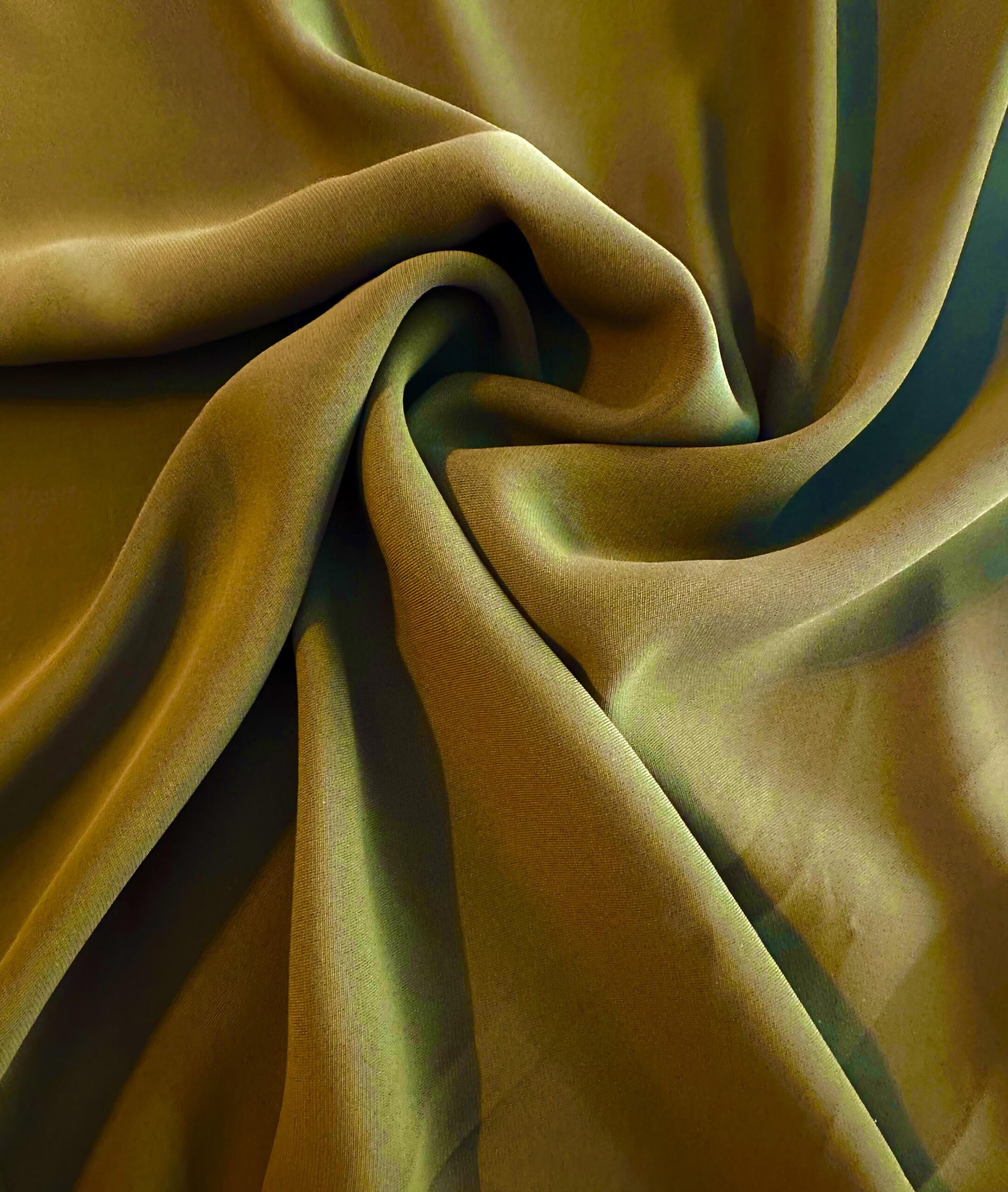 Italský krep polyester v olivově zelené barvě, 100 % polyester, šíře 140 cm. Ideální na šaty, halenky, sukně, kalhoty i saka.