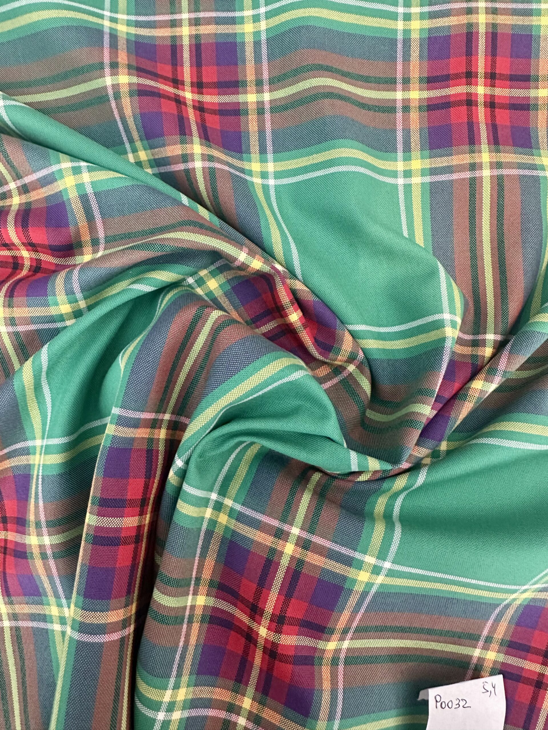 Italská hladká bavlněná látka – vícebarevná kostka (zelená, červená, žlutá, fialová) – 100 % přírodní bavlna pro kalhoty, sukně a košile