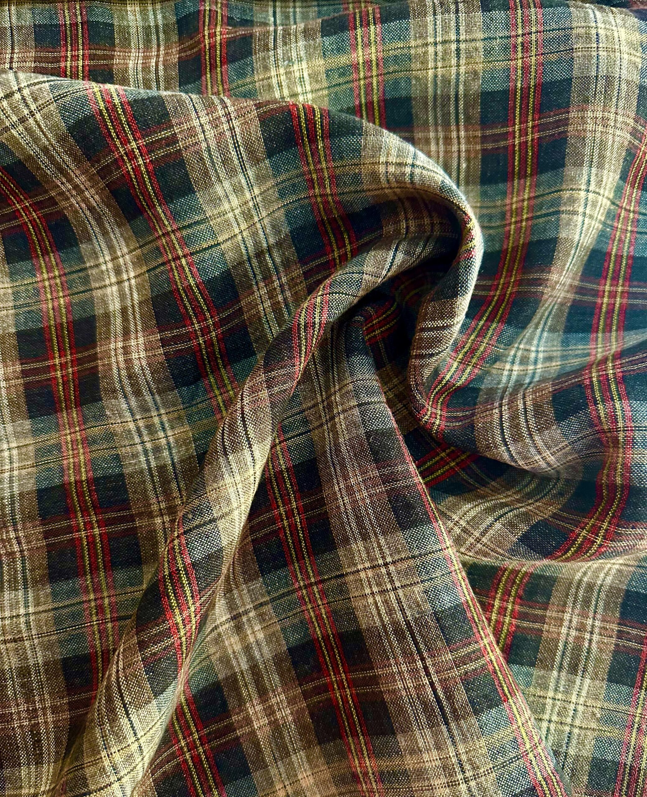 Lněná látka kostkovaná hnědo-zelená s červeným pruhem | Tessuti Butik
