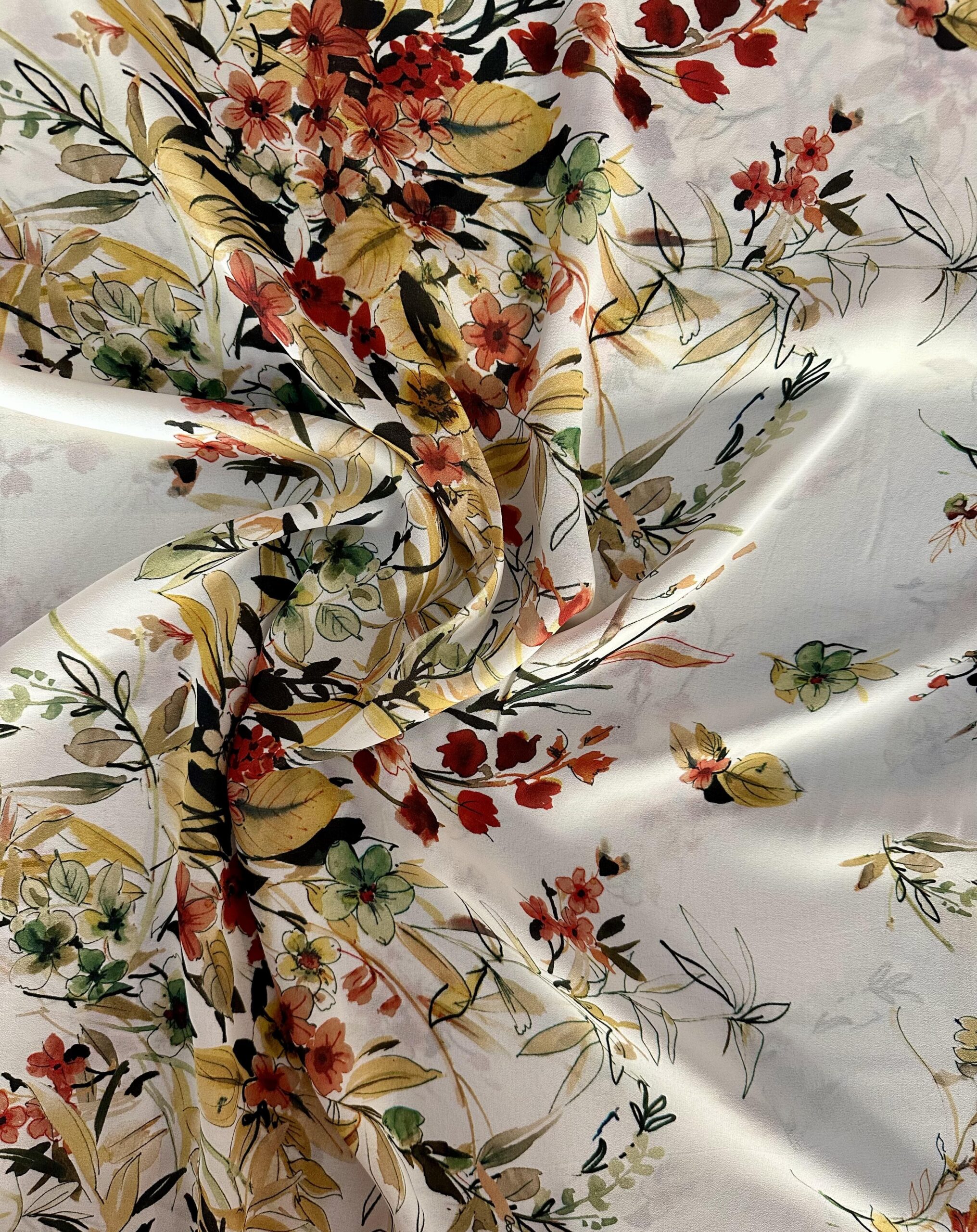 Lehká a splývavá italská viskóza metráž s květinovým vzorem v teplých barvách. Pokud chcete koupit látku v Praze, obchod Tessuti Butik nabízí originální italské látky pro oděvy pro šaty, sukně i halenky.